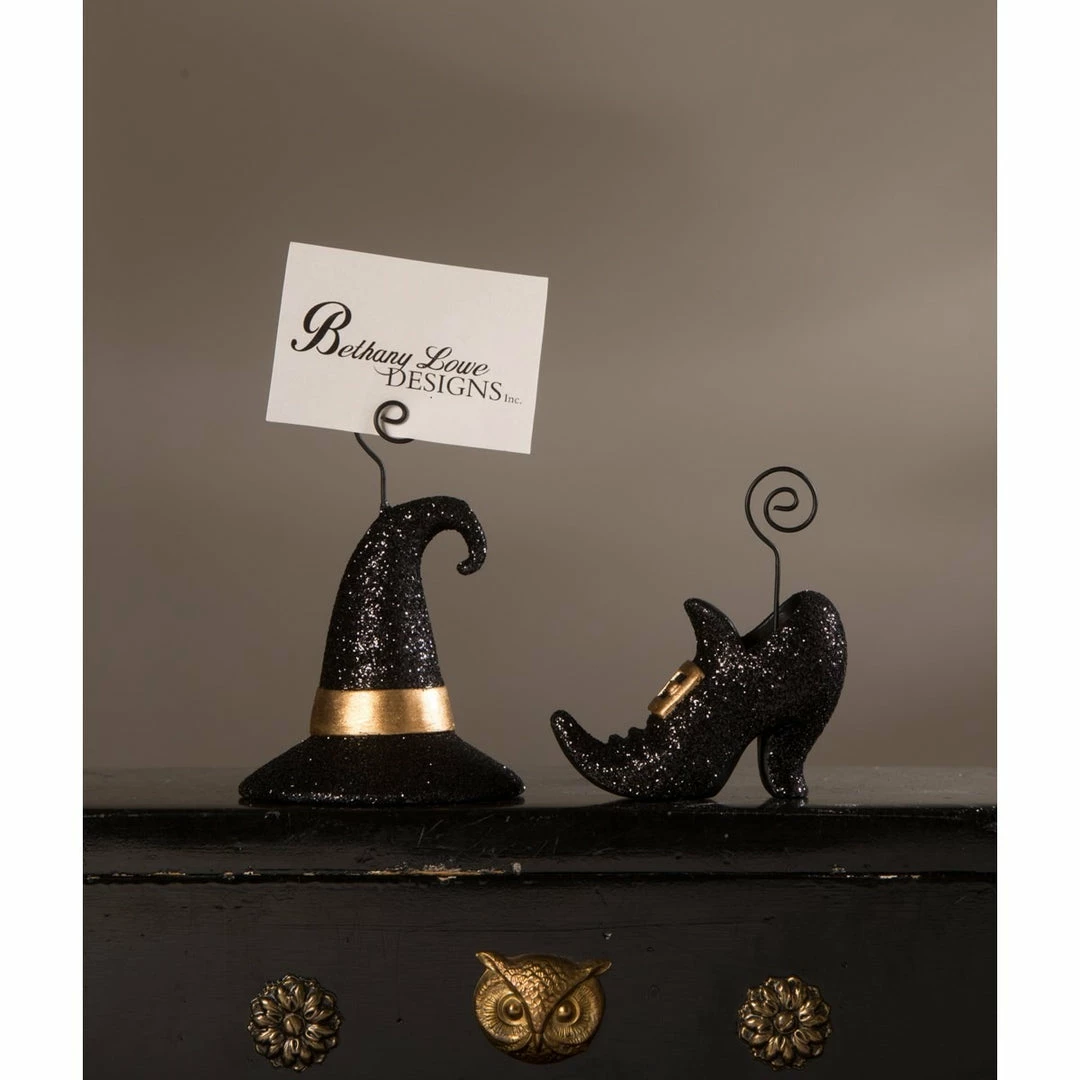 Set your Halloween table with these enchanting place card holders. A wicked witch hat and shoe covered in black glitter with gold metallic accents will catch guests’ eyes.