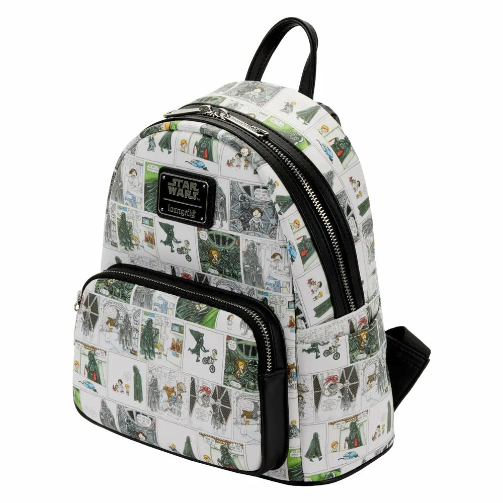 The Loungefly Darth Vader Comic Strip Mini Backpack is made of vegan leather (polyurethane). Backpack has adjustable shoulder straps, sturdy metal hardware, and features printed details. Take note of the coordinating inside lining. Please note: Patterns will vary with all-over-print styles. Not every piece will look identical nor will every piece be an exact match as to what is pictured online