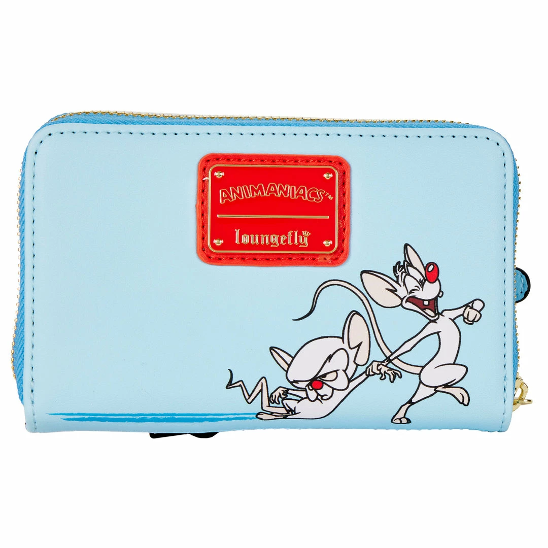On the front, the Warner siblings burst through the iconic Warner Bros. Tower. On the back, Pinky and the Brain are ready to take over the world. Note the coordinating interior lining, which includes a motif of Yakko, Wakko, and Dot. wallet features include the following details: vegan leather (polyurethane), sturdy silver-colored metal hardware, and applique and printed work.