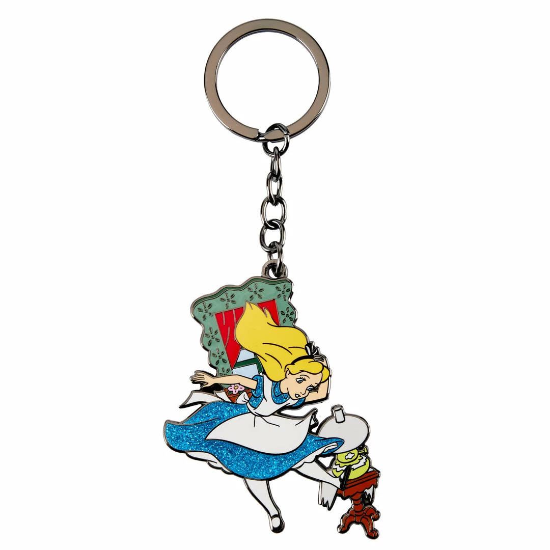 Catch Alice as she tumbles into wondrous adventures with this Alice in Wonderland Key chain. The enamel key chain features Alice as she falls down the hole that leads to Wonderland, her glitter-detailed blue dress billowing in the wind. As she falls, she passes a window and a lamp. Take her with you on all of your journeys.
