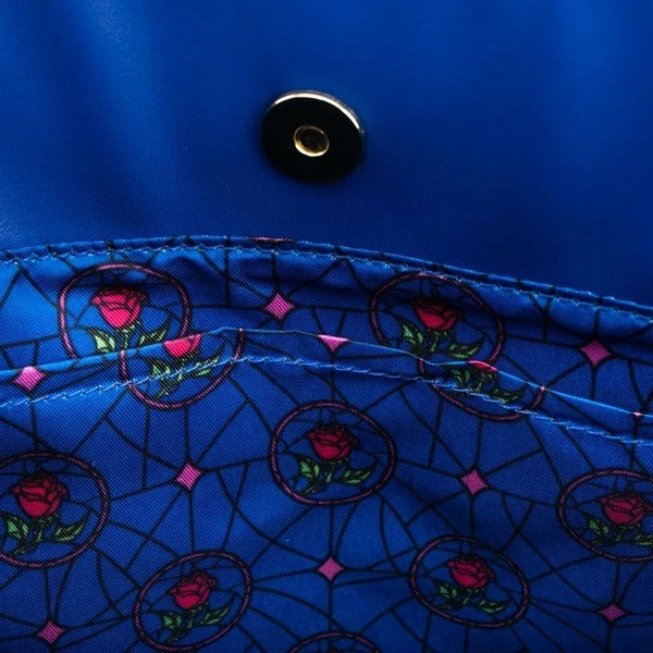 The Disney Beauty and the Beast Belle Castle Crossbody Bag is made of vegan leather (polyurethane). Bag has an adjustable shoulder strap (detachable), sturdy metal hardware, and features: applique, and printed details. Take note of the coordinating pattern of the inside lining fabric.