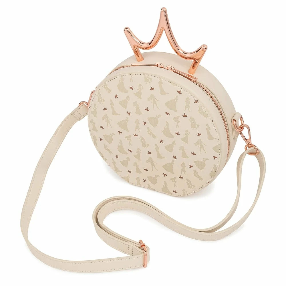 The Loungefly Disney Ultimate Princess Metal Crown Crossbody Bag is made of vegan leather (polyurethane). Bag has an adjustable shoulder strap, molded metal handle, sturdy metal hardware, and features: debossed, and metallic printed details. Take note of the coordinating pattern of the inside lining fabric. Please note: Patterns will vary with all-over-print styles. Not every piece will look identical nor will every piece be an exact match as to what is pictured online