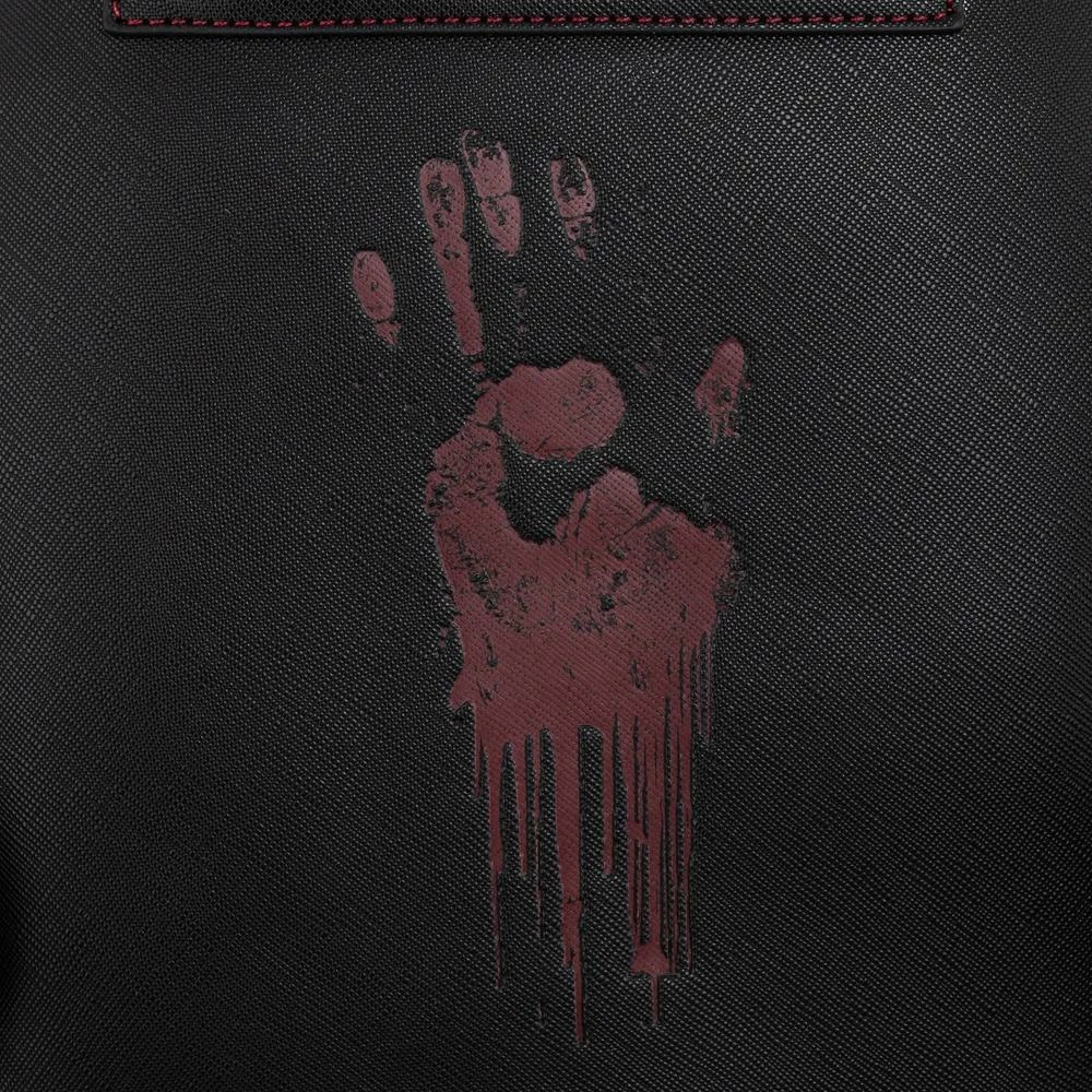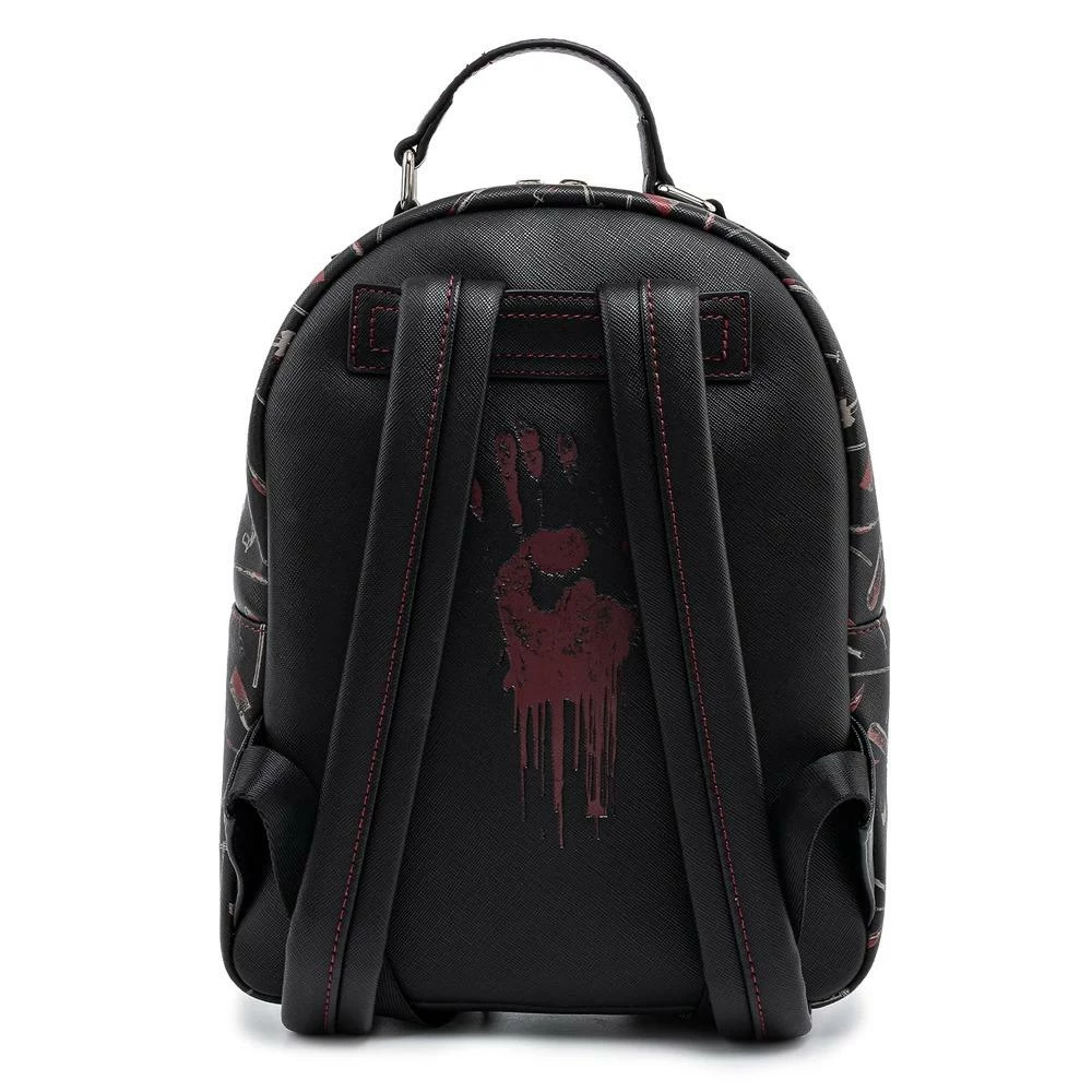 No need to wait for Friday the 13th! The Loungefly Friday the 13th Jason Mask Mini Backpack is here to put the fear in your collection. The background pattern features an assortment of weapons. On the front and center is Jason’s hockey mask which glows in the dark. It’s a striking design making it an appealing accessory for Halloween-themed outfits.