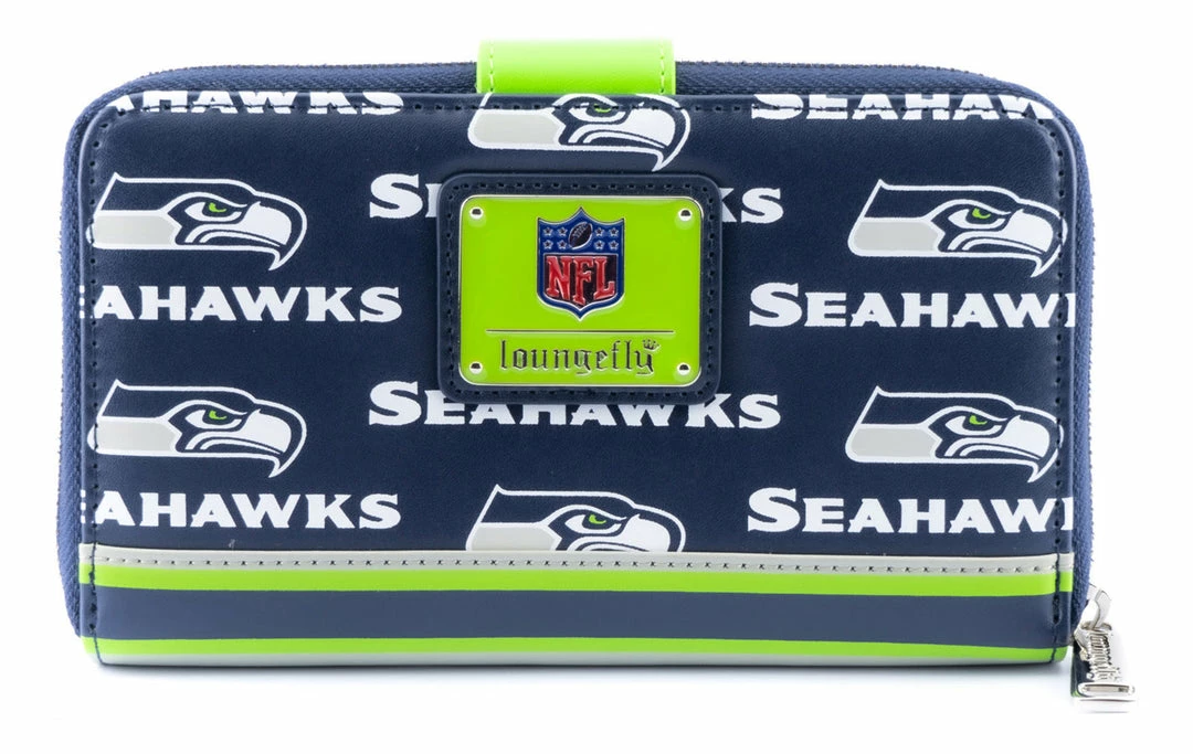 Represent your favorite team whether you’re on your way to practice, a game, or just out running errands with the National Football League Loungefly accessories! This NFL Seattle Seahawks Logo Zip Around Wallet is a touchdown for any Seahawks fan. This dark blue wallet is covered in the team’s logo and features a molded metal rivet of the team logo on the snap closure. It’s perfect for carrying everything you need to and from games.