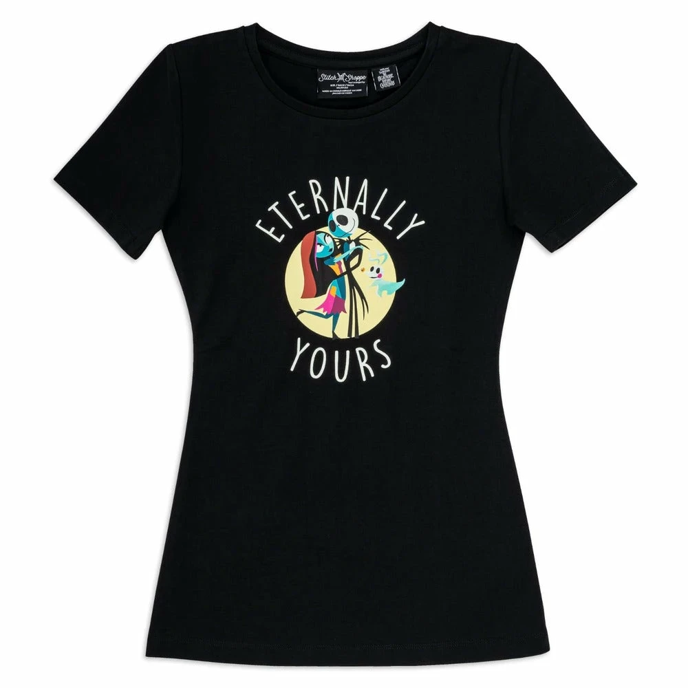 The new Disney Stitch Shoppe The Nightmare Before Christmas Eternally Yours “Ariana” Fashion Top will have you, and your collection, singing on the hilltop! On the center front of this soft jersey shirt is Jack Skellington and Sally, embracing in front of the full moon with Zero at their side.