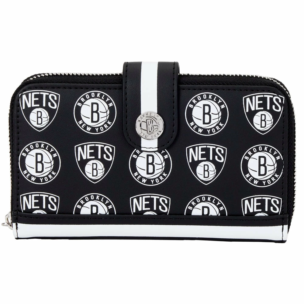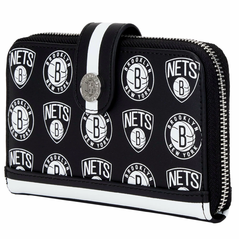 Create a winning game plan that shows your team spirit with this NBA Brooklyn Nets Logo Mini Backpack. The embroidered logo patch for the Brooklyn Nets prominently appears above the front zipped compartment. The logo includes a shield, with the word “NETS” arcing over a white basketball, with a black “B” in the middle. A debossed motif of another Brooklyn Nets logo—a black B encircled by the words “Brooklyn New York” in all capital letters— is set against a black background. White trim adds accent and contrast in team uniform color.