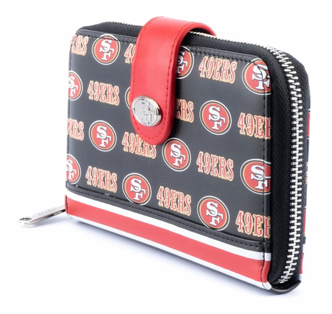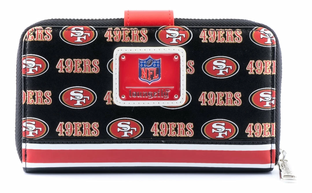 Represent your favorite team whether you’re on your way to practice, a game, or just out running errands with the National Football League Loungefly accessories! This NFL San Francisco 49ers Logo Zip Around Wallet is a touchdown for any 49ers fan. This black wallet is covered in the team’s logo and features a molded metal rivet of the team logo on the snap closure. It’s perfect for carrying everything you need to and from games.