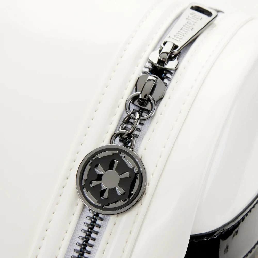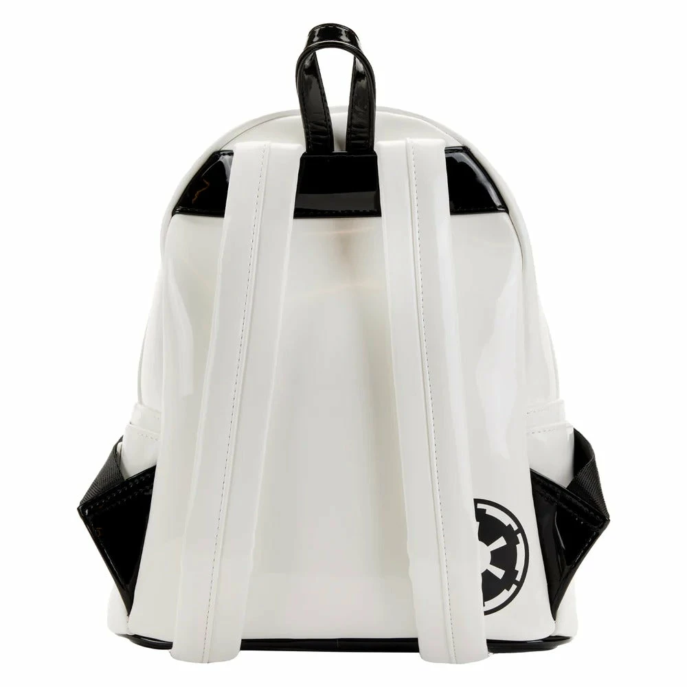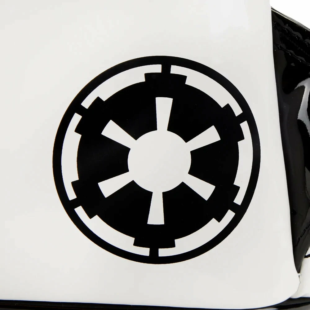 Blast through your day with the help of a Star Wars Stormtrooper with this Stormtrooper Lenticular Cosplay Mini Backpack. The backpack, which includes a zipped front pocket, takes the shape of a Stormtrooper’s white helmet and face. A lenticular screen placed in the eyewear reveals, in an alternate view, Hans Solo, Chewbacca, and Princess Leia. An embroidered Stormtrooper symbol appears on the back.