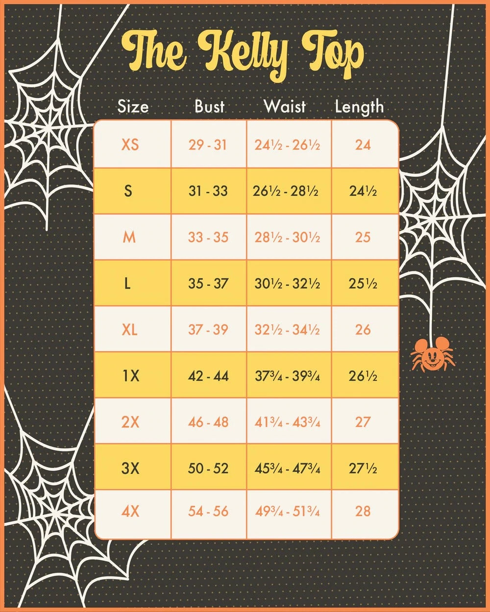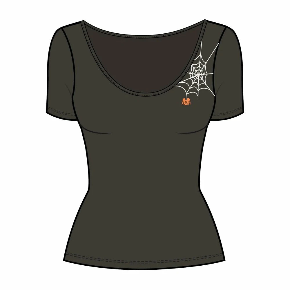 Be scary fashionable this Halloween with the Stitch Shoppe Mickey Mouse Spider Web Kelly Fashion Top. The top features embroidered white spider webbing, accompanied by a little orange Mickey Mouse spider. The lanterns are lit to reveal this hauntingly cute Disney design.